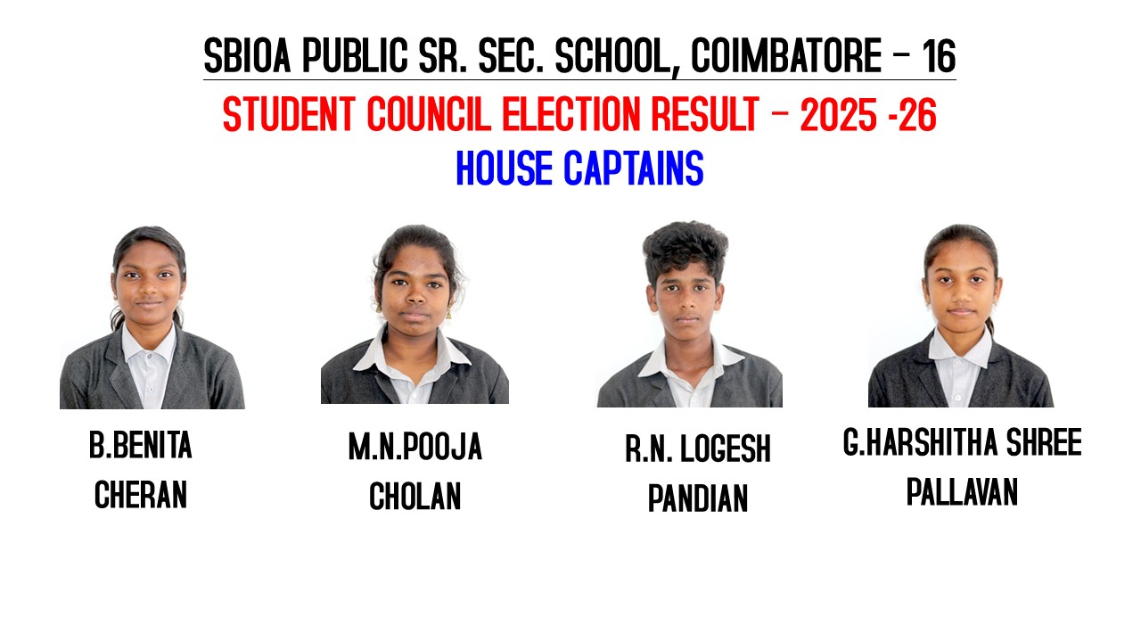| 11 | Pallavan House Captain | Harshitha Shree G. | 12A | Pallavan |