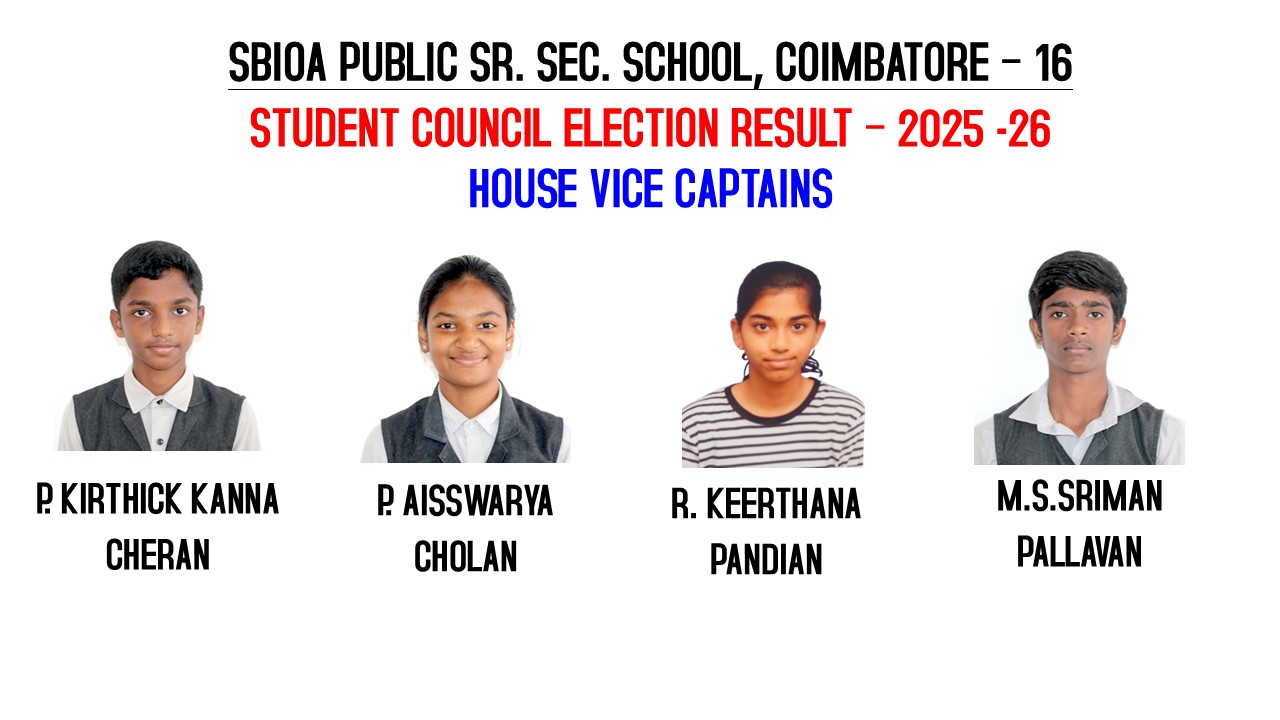 | 6 | Cheran House Vice Captain | Kirthick Kanna P. | 11A | Cheran |